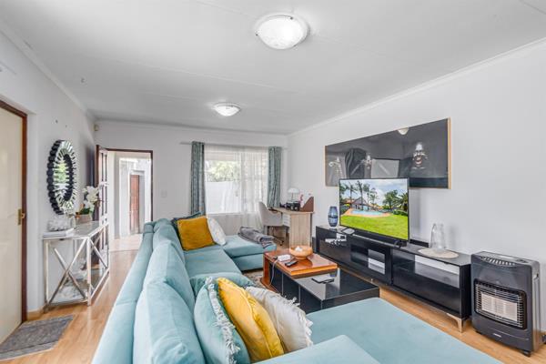 The living and dining areas flow seamlessly outdoors, with the front door opening onto a covered patio overlooking the beautifully maintained front garden. Additional access to the back garden is provided via a sliding glass door from the living area as well as a convenient kitchen door, making this home ideal for entertaining and family living.