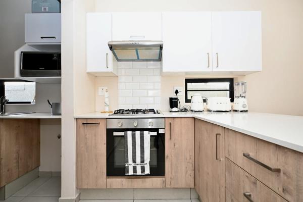 The well-appointed kitchen includes ample cupboard space, a separate scullery, and a practical breakfast counter. Elegant tiling throughout enhances the light-filled living areas, creating a warm and inviting atmosphere.