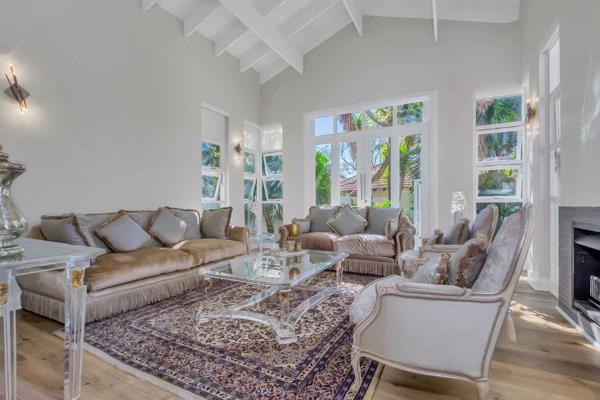 Grand, and beautifully renovated, with a sleek touch of elegance throughout. .. Visually pleasing, with so much natural light, and gorgeous wood vinyl flooring, in todays modern look. The high ceilings and double volume entrance add to the glamourous ambience of this home. A quiet lounge with huge glass windows and fireplace, overlooks the garden. The dining room has a lovely water feature and opens onto the covered patio. The family room is absolutely stunning with large windows and a wonderful view of the pool and garden. The kitchen has a lovely central island with a gas hob and there are so many cupboards, including a huge utility area for storage and an additional cooking area. This kitchen is fit for a large family to enjoy cooking together. The covered patio has plenty of space to relax in peace and quiet with a view of trees.
