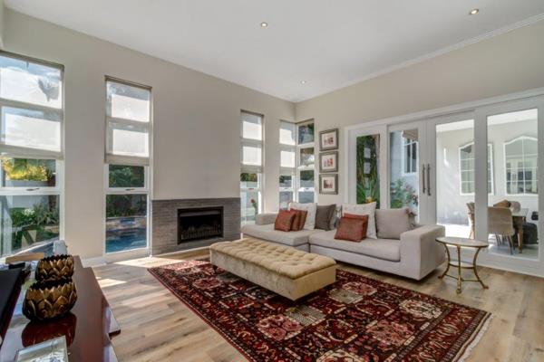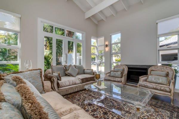 High ceilings and white Plantation shutters on the windows, with sliding doors leading to the landscaped garden and swimming pool.