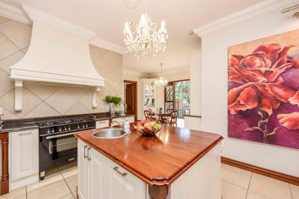 Upon entering, you are greeted by a magnificent entrance hall with a double marble staircase, setting the tone for the grandeur that awaits. The ground floor features a spacious dining room with fireplace and built in wine storage, a comfortable lounge perfect for relaxation with views over the estate and stacking doors to the large patio plus a TV family room , complete with built in bar and fridge and a large chef''s kitchen , double ovens, free standing gas range complete with a scullery also a gorgeous centre island. Serve breakfast to the family in the dedicated breakfast room.