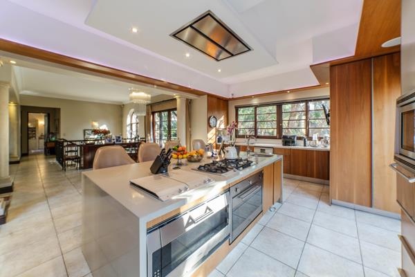 Step into refined elegance with this breathtaking 5-bedroom, triple-level masterpiece, designed for seamless indoor-outdoor living, luxurious comfort, and elevated entertaining. Nestled in a serene setting with nature views, a private river walk, and lush gardens, this home blends sophisticated architecture with warm, livable spaces. A grand entrance hall welcomes you to a spacious balcony overlooking a sparkling pool and lush surroundings. The open-plan lounge features a cozy wood-burning fireplace and flows effortlessly into a gourmet kitchen equipped with a center island, breakfast nook with LED lighting, a Gaggenau built-in coffee machine, and state-of-the-art appliances. This space opens onto two outdoor balconies, with an elegant dining room and gas fireplace completing the main living area. A guest bathroom and a soundproof home cinema room, along with a modern office/library, add to the functionality and luxury of the middle level.