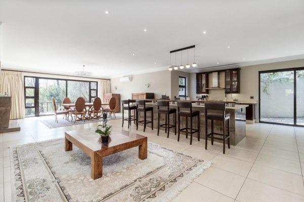 The open plan flow is seamless, offering four reception rooms that lead out onto a swimming pool and deck area showcasing the Jukskei River and river front. It is a privilege to call this residence home. The modern kitchen is a chefs delight, graced with quality finishes and fittings. There is a bedroom/study downstairs with a guest bathroom.