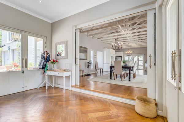 Enter through a welcoming automated gate with ample visitors parking, and step into a breathtaking double-volume entrance hall adorned with striking oak floors. To your right, a spacious formal lounge with a wood-burning fireplace invites you in, whilst high ceilings and white exposed beams create an architectural statement of warmth and sophistication.