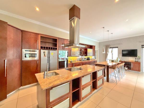 At the centre of the home lies a gourmet kitchen that blends functionality with high-end design. Featuring lofty ceilings, double islands, Caesarstone countertops, a breakfast nook, and a seamless wrap-around layout, this culinary space is both inspiring and practical. A separate scullery keeps the everyday workings of the home discreetly tucked away.
