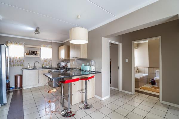 This contemporary 2-bedroom, 2-bathroom apartment, spanning 66 sqm, offers a modern open-plan living experience in Dainfern, Sandton. The kitchen is a highlight, featuring sleek light wood-grain and two-tone cabinetry, complemented by dark speckled granite countertops and a functional breakfast bar. It comes equipped with an integrated washing machine, a built-in oven, and a gas hob, providing both style and convenience. Ample counter space and integrated storage solutions ensure a clutter-free environment, while the tiled flooring throughout the living areas ensures easy maintenance. Natural light floods the space through large windows, enhancing the bright and airy atmosphere.