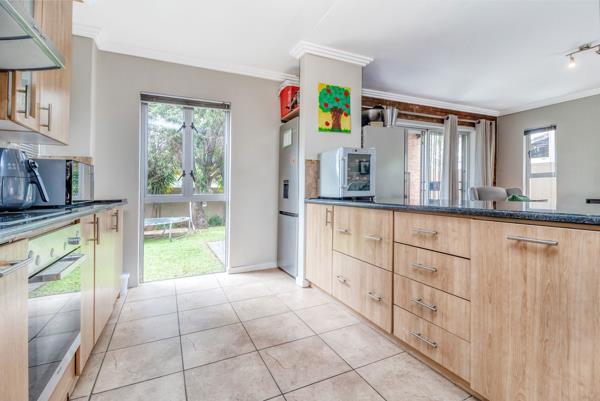 The sunny downstairs living area has sliding door leading out to covered patio with built-in braai. Spacious private wrap-around garden, perfect for entertaining and furry friends.
