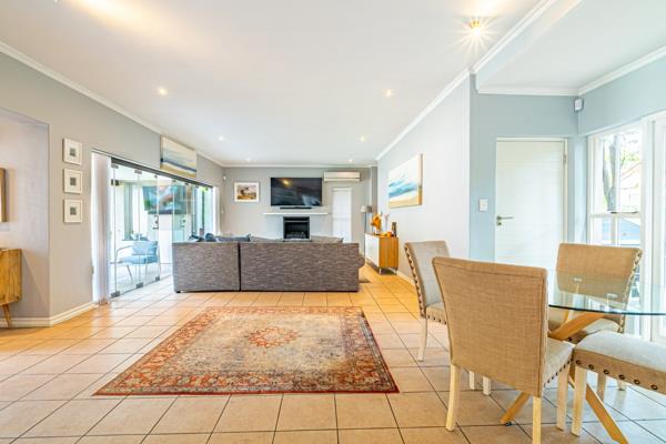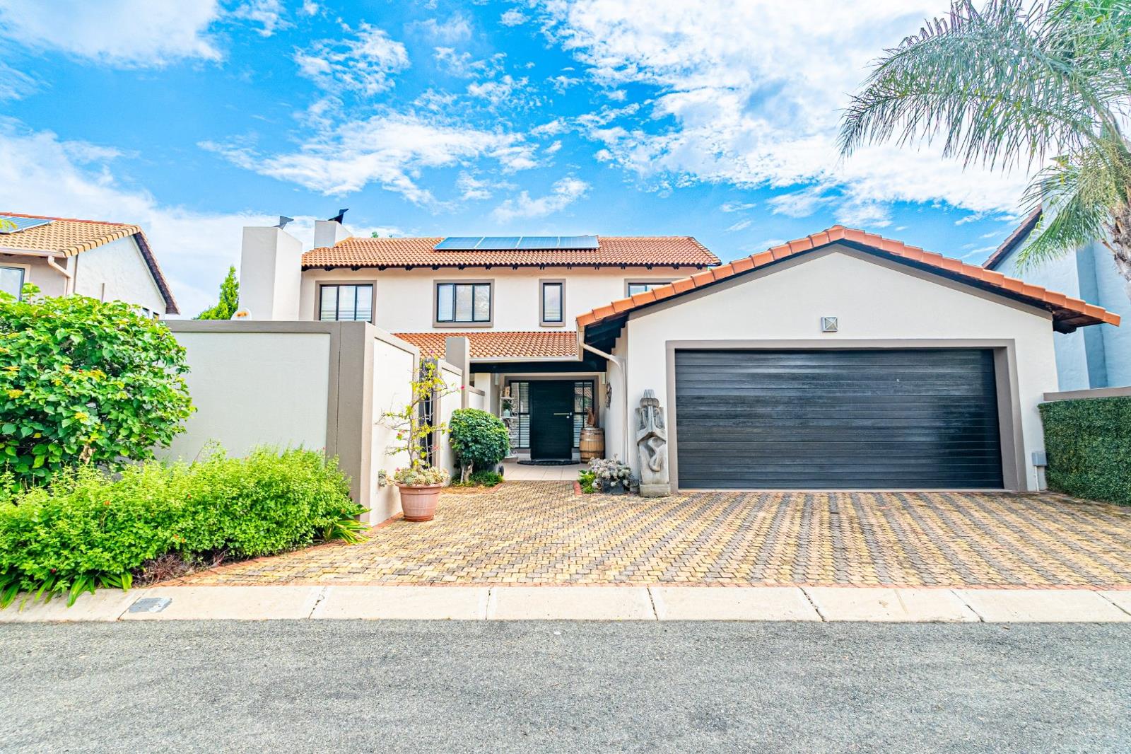 The interior of the home is designed for both relaxation and entertainment. An open-plan lounge, complete with a cozy fireplace and efficient air conditioning, transitions smoothly into the dining area, fostering a warm and inviting ambiance. The modern kitchen is equipped with sleek granite countertops, making meal preparation a pleasure. Glass stacking doors lead to a covered patio and a refreshing swimming pool, perfect for outdoor enjoyment. The main bedroom serves as a tranquil haven, featuring an en-suite bathroom and air conditioning for ultimate comfort. The remaining two bedrooms share a beautifully designed family bathroom. Additional conveniences include a guest toilet located on the ground floor, a double garage, and even a golf cart, further enhancing the lifestyle appeal of this exceptional Dainfern property.