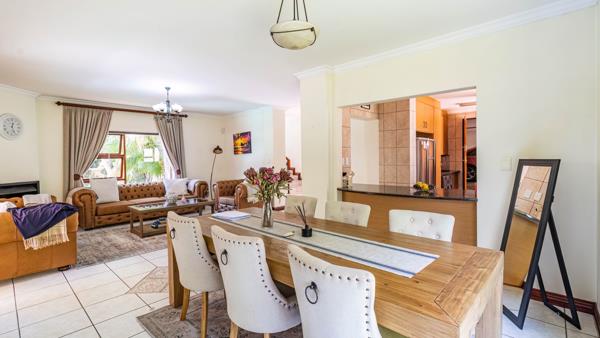 This home is designed for both grand entertainment and comfortable daily living. You are welcomed by an entrance hall and a guest toilet. The heart of the home features a tiled open-plan lounge, dining area, and a private lounge, all warmed by a fireplace and flowing out through stacking doors to a covered patio with a built-in braai. This space overlooks the private garden and sparkling pool, creating a perfect indoor-outdoor flow. The modern kitchen includes a practical scullery that leads to a quiet courtyard. Upstairs, four carpeted bedrooms provide ample family accommodation, including a full en-suite main bedroom and two bedrooms with access to private balconies.
