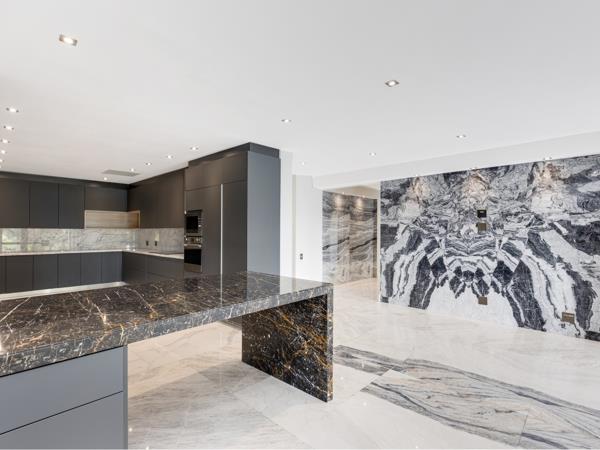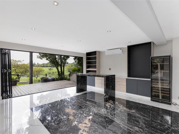 The entrance sets the tone of this home with a magnificent chandelier, inviting you into open plan spaces emphasising indoor outdoor living at its best, overlooking the river and golf course. Bespoke designed state of the art kitchen and bar with marble counter tops one touch smeg hob integrated microwave , recessed coffee station and a separate scullery.