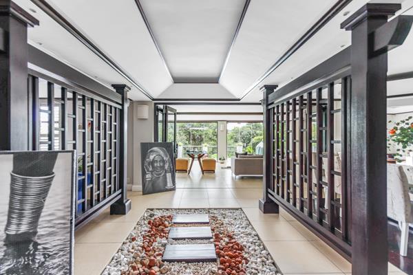 This breathtaking Balinese-style home, situated on the golf course, offers majestic views and an exceptional blend of luxury and tranquility. Upon entering, you are greeted by a serene koi pond and a grand double-volume entrance, leading to expansive open-plan living spaces that exude Asian fusion flair. The open-plan kitchen flows seamlessly into the lounge and dining areas, while the indoor patio features large glass stacking doors that frame incredible golf course views. The ground floor also includes a self-contained study with a built-in library and a spacious guest suite, perfect for visitors.