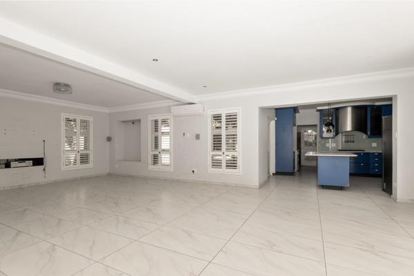 This inviting home boasts an open-plan layout. A private formal lounge featuring a cozy gas fireplace offers the perfect retreat for quiet evenings or elegant entertainment. The dining room is practical, featuring a built-in server that adds style and convenience for serving meals. The TV room, fitted with air conditioning, flows seamlessly into the traditional-style kitchen, creating a warm and welcoming heart of the home. The kitchen is a chefs delight, showcasing quartz countertops, a versatile center island that doubles as a breakfast bar, and a premium Smeg 5-plate gas hob. A separate scullery adds convenience and practicality, keeping the living spaces uncluttered and functional.