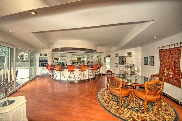 A large entertainment room with a built-in bar flows onto a covered patio, overlooking a swimming pool and a neat, easy-care garden with Astro turf in selected areas. Its a great setup for casual gatherings or relaxed family time outdoors.