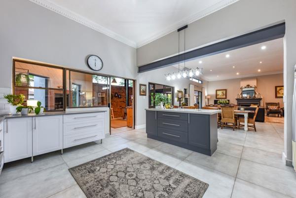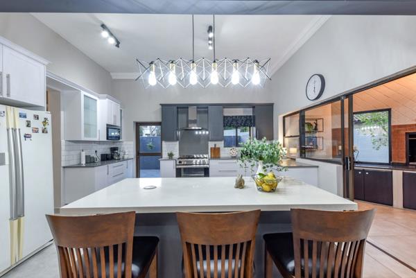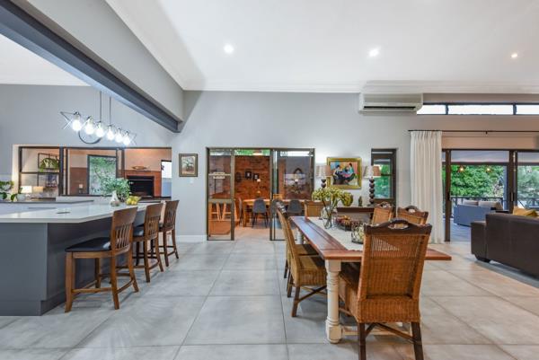 The kitchen flows effortlessly into the dining and lounge areas, all opening out onto a generous wrap-around verandah. This elevated, enclosed patio is finished with stacking doors and a built-in braai, offering year-round entertaining with tranquil views over the garden and pool below.