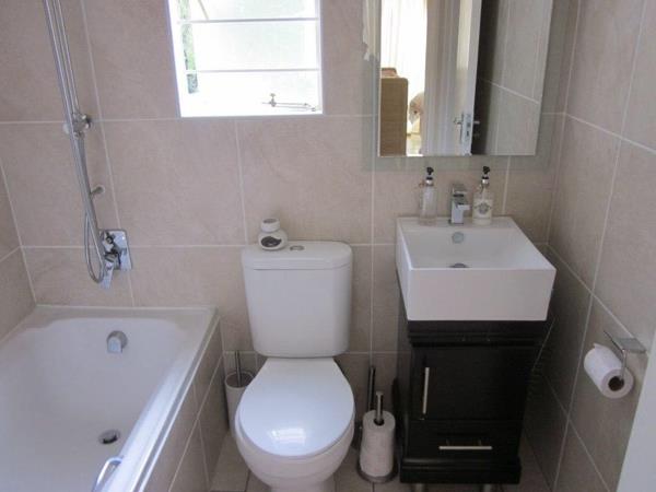 The full bathroom features a bathtub with a mounted shower, combining comfort and convenience.