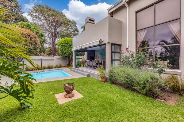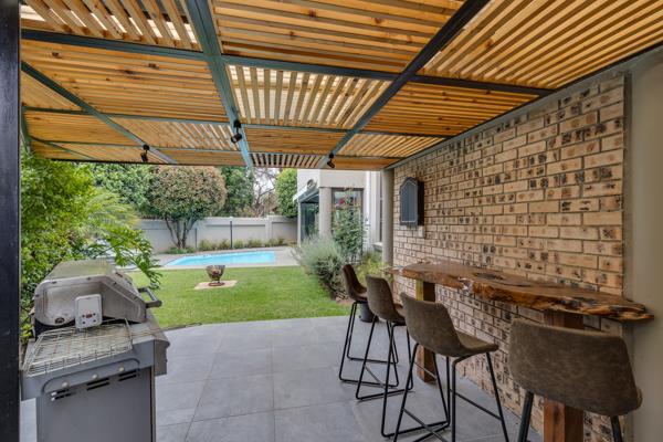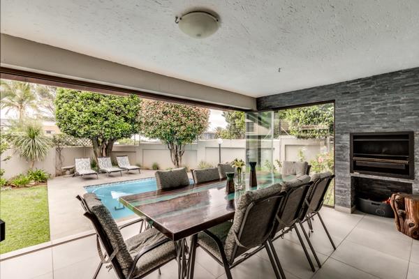 Glass doors open to a large, covered patio with a built-in braai and retractable awning, plus an additional outdoor entertainment zone for year-round enjoyment. A sparkling pool, embraced by a lush, manicured garden ensures privacy and tranquillity. Double automated garage and parking for 3 cars, and full staff accommodation.