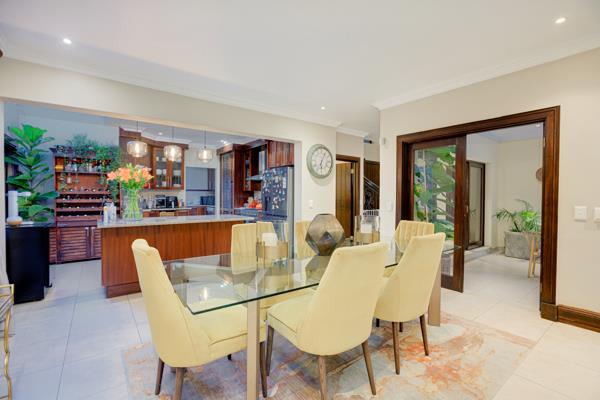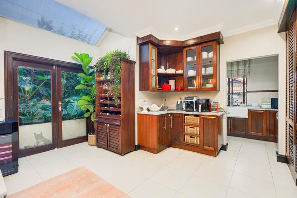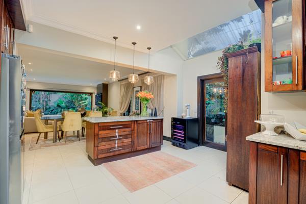 Offering double door/double volume entrance hall, flowing to the large living areas, including lounge/dining areas and open plan kitchen. The lounge is spacious with a wood burning fireplace and opens to the patio, inviting pool and private garden. The kitchen is modern, with ample cupboard space and has a separate scullery with place for all 3 appliances, and opens to the courtyard.