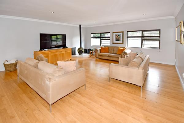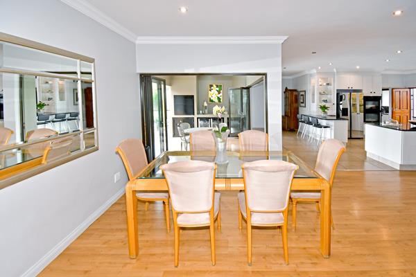 The entrance hall opens onto space that will take your breath away. Wooden flooring in lounge with fireplace opening onto a large dining room and family room. The tiled modern open plan kitchen is what dreams are made of. Glass display units. Granite tops. Gas and electric stove. Double oven. Great for family get togethers. Separate scullery.