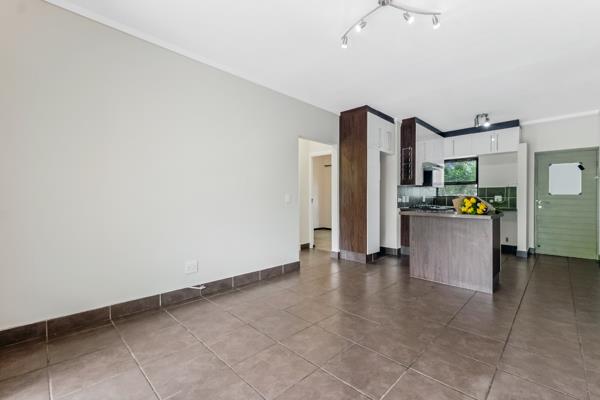 Discover modern lock up and go living in this inviting first floor, 2-bedroom, 1-bathroom apartment, perfectly situated within a secure estate in Douglasdale, Sandton. This residence offers a contemporary open-plan layout that seamlessly integrates the living area with a stylish kitchen. The renovated kitchen is a highlight, featuring sleek white glossy cabinetry with additional cupboarding, dark countertops, a built-in oven, gas hob, extractor fan, and a practical kitchen island that doubles as a breakfast bar, providing ample storage and preparation space.