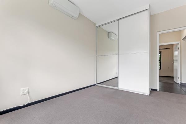 The light and bright living space, leads out to a private balcony, offering pleasant green views, creating a tranquil extension of your home. Both bedrooms are designed for comfort, featuring neutral walls, soft carpeting and built-in cupboards with sliding mirrored panels and aircon in the main bedroom. The modern bathroom boasts a clean design with a vessel sink vanity and an enclosed shower. A water storage tank ensures back up water during outages.