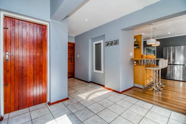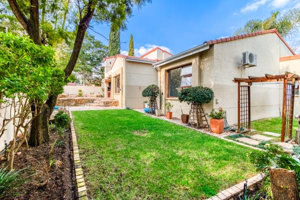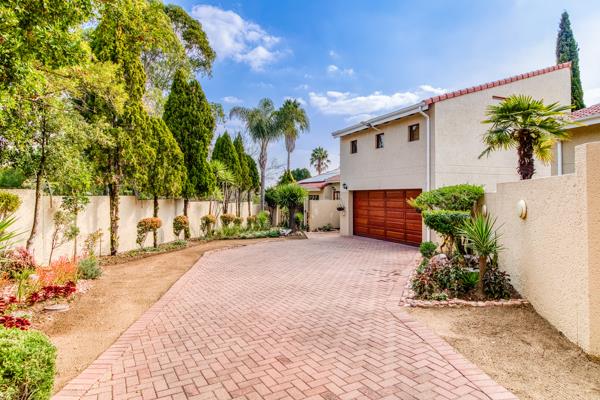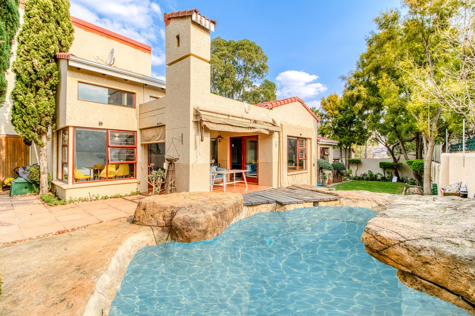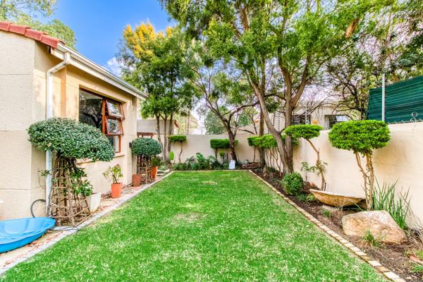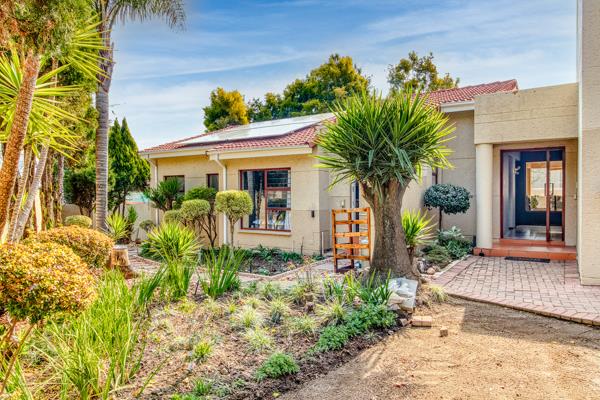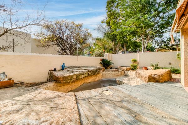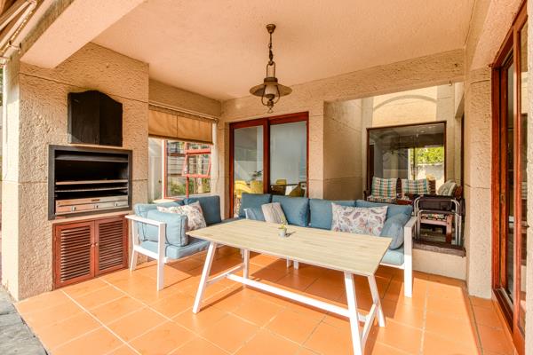 There are sliding glass doors from the living and dining areas opening out to a covered entertainment patio with a built-in braai that leads out onto a lush manured garden overlooking the sparkling splash pool.