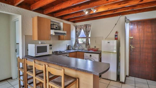 Open plan kitchen with ample cupboards, breakfast bar, space for fridge and one appliance.
