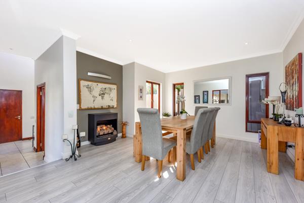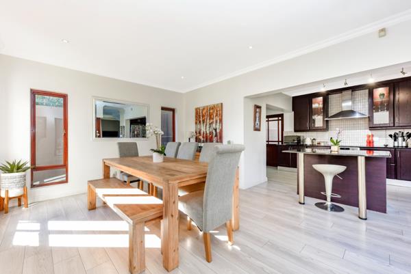 The modern kitchen comes complete with a separate scullery, seamlessly flowing into the open-plan dining and family room. Large windows and doors fill the living areas with natural light, all overlooking the beautifully maintained garden, sparkling pool, and inviting jacuzzi.
