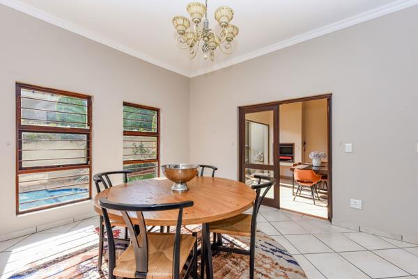 As you enter, you are immediately welcomed by an abundance of natural light and open space. To your left, a generous open-plan kitchen boasts ample countertop and cupboard spaceperfect for everything from casual family dinners to hosting festive gatherings. The kitchen seamlessly flows into a sunlit dining area, which opens onto a private, enclosed patio. This outdoor haven overlooks a lush garden and sparkling blue swimming pool, creating the ultimate indoor-outdoor living experience.