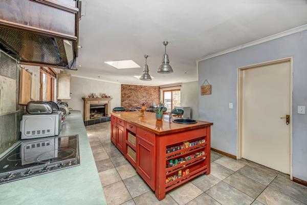 Open plan living : The heart of the home features an open charming, vintage-inspired kitchen complete with a bold red island, built-in open shelving, exposed brick accents, and sky-lit ceilings that allow natural light to flood the space-perfect for culinary creativity and casual family moments alike.