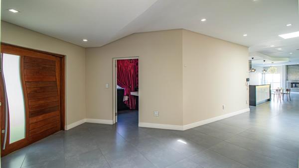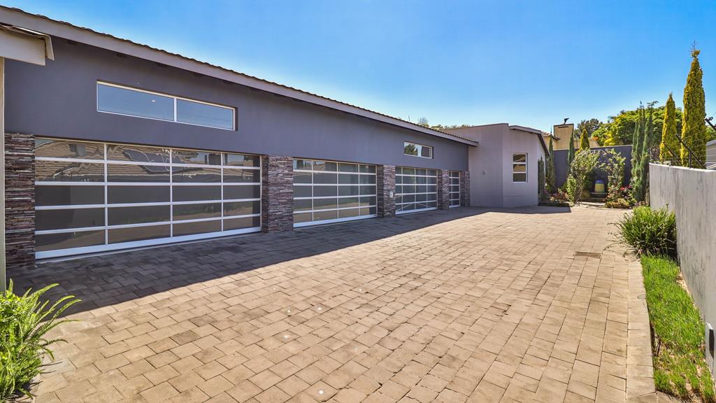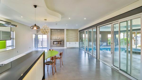 From the moment you enter, you are welcomed by an abundance of natural light and generous open-plan living spaces. The central living area features a skylit dining room, an expansive lounge with a fireplace, and a chefs kitchen boasting Caesarstone-style counters, gas hob, dual electric ovens, microwave and space for a double-door fridge, with a separate scullery opening to the courtyard. This flows effortlessly to the impressive indoor entertainment wing with swimming pool, jacuzzi, built-in braai, cabinetry and fridge space, leading out to a charming bougainvillea-draped patio, fire pit and immaculate garden.