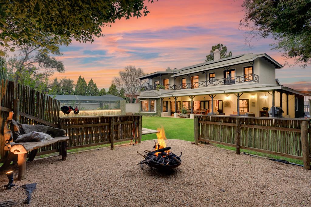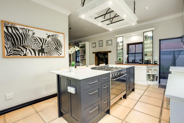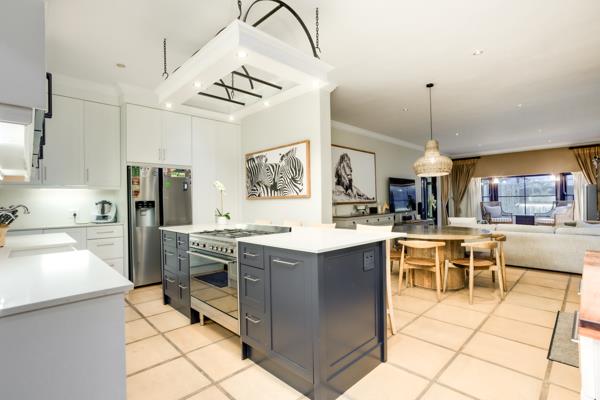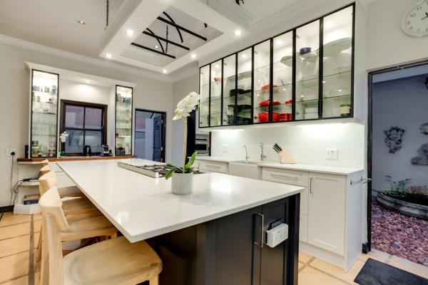A grand double-volume entrance hall creates an immediate sense of space and welcome, with a discreet guest cloakroom tucked to the side the perfect introduction to this expansive home. Downstairs living features extra-high ceilings and a choice of elegant reception areas, including a formal lounge and study with an interleading wood burning fireplace, a spacious TV room, and dining space, all centered around an open-plan kitchen with marble countertops, a central island, gas hob, and a large walk-in scullery. A closed-combustion fireplace brings warmth and atmosphere to the kitchen and adjoining living zone, making it the true heart of the home. A well-sized guest suite with its own en-suite bathroom (shower, basin, and toilet) completes the ground floor, offering excellent privacy for visiting family or work-from-home flexibility.