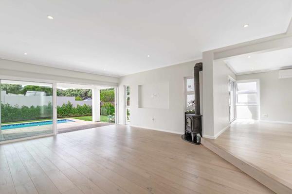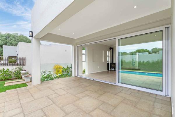 The sizable dining room has a beautiful view over the landscaped garden and is open-plan to the kitchen. The modern kitchen is fitted with excellent finishes and a Samsung gas hob. The white Caesarstone countertops add to the elegance of this kitchen, there is even a built-in pop-up charging station for convenience. The fully equipped scullery has space for 2 appliances. The lounge is very spacious, with stack back doors onto the beautiful outdoor patio overlooking the solar heated swimming pool and magnificent private garden. There are 3 delightful bedrooms with 2 bathrooms, the main bathroom is en-suite. The entrance to the double automated garage is covered allowing easy access into the home.