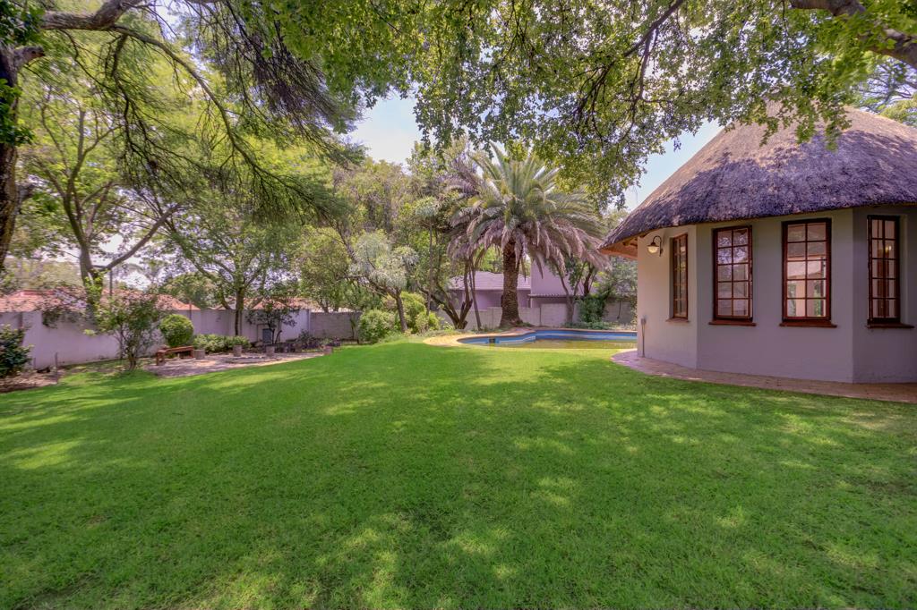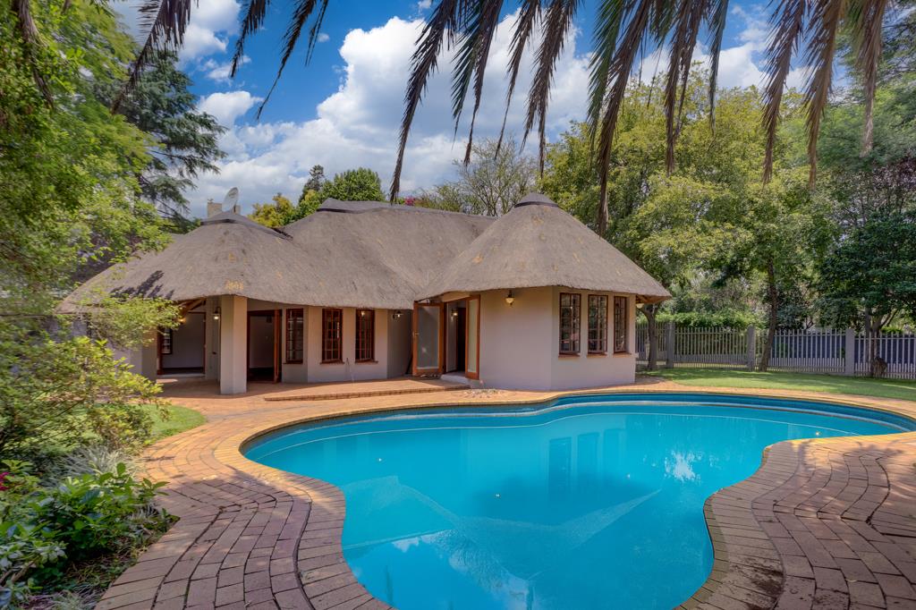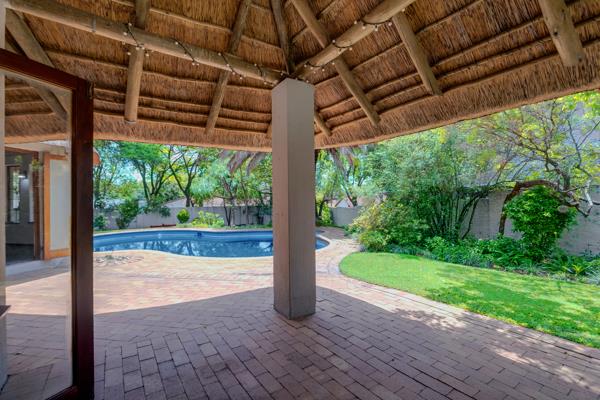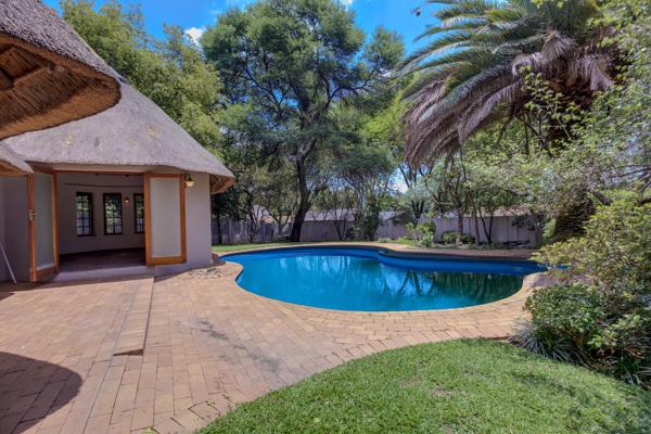 This charming double-storey thatched residence is set within the heart of Fourways Gardens, offering a perfect blend of character, space, and tranquility. Surrounded by a beautifully landscaped garden with mature trees and lush lawns, the home enjoys a wonderful sense of privacy and natural serenity ideal for family living and entertaining.