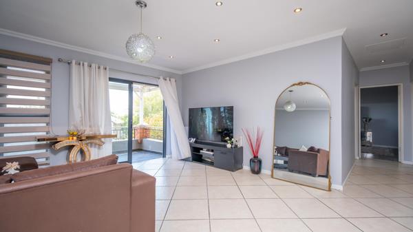 The open-plan living area extends to a large, covered patio with a built-in braai and scenic views.
