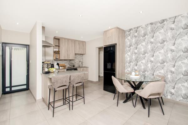 The open-plan kitchen features Caesarstone counter tops, a breakfast nook, a gas hob with an electric oven and extractor fan as well as double sink, space for a single door fridge and 1 under-counter plumbed appliance and loads of cupboard space.