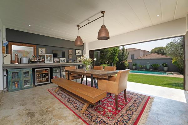 A seamless extension of these open-plan living spaces is the enclosed all-season entertainers patio, thoughtfully designed with year-round hosting in mind. Featuring a built-in braai, bar counter, space for fridges, and ample room for a large dining table, this versatile space is perfect for long summer dinners, watching weekend sports with friends, or cozy winter evenings. All of it opens up to the manicured private garden and an inviting pool, complete with a tranquil water feature. A shaded seating area under mature trees adds another layer of outdoor charm and relaxation.