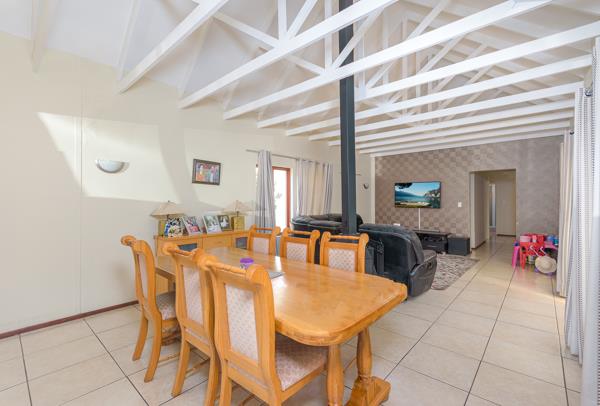 Residents of this estate can also enjoy the communal swimming pool, accompanied by an attractively covered braai area featuring exposed white trusses that complement the home''s design.