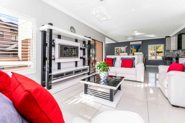 Welcoming entrance hall flows onto an open plan formal & family lounge and dining area, spilling onto a private sunny covered patio overlooking a private manicured garden. Sizeable open plan kitchen with Caesarstone counter tops and high gloss fitted cupboards, SMEG gas hob with electric oven and extractor fan, breakfast bar, double door fridge space, separate scullery area that has under counter space for your appliances, pantry cupboard, ample built-in cupboards. Guest cloakroom and storage under the staircase completes the downstairs floor plan.