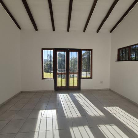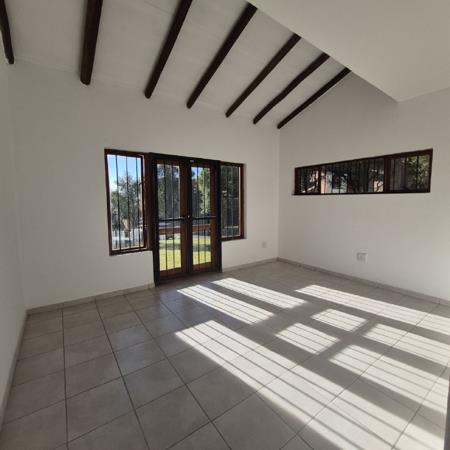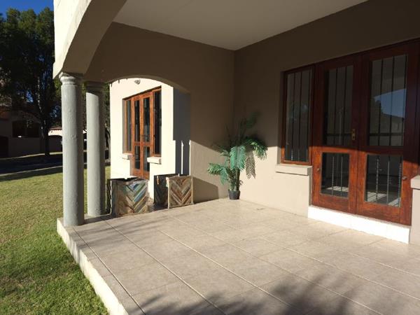 The lounge opens onto a private patio through double doors with a sliding security gate. The patio features a built-in braai perfect for outdoor entertaining.