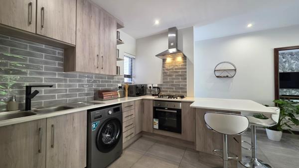 This spacious residence offers an inviting open-plan layout, seamlessly connecting the living area with a sleek, well-appointed kitchen. The kitchen boasts light wood-grain cabinetry, pristine white Quartz stone countertops, a chic grey tiled backsplash, and integrated appliances including a gas hob, and extractor fan, with space for a fridge and washing machine. A convenient breakfast bar provides a casual dining space. The living space is enhanced by recessed lighting, durable tiled flooring, and a distinctive accent wall, creating a sophisticated ambiance.