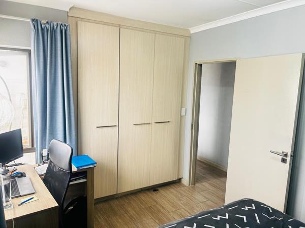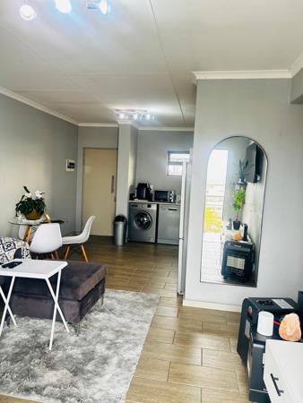 The two bedrooms are wellsized, each with builtin cupboards for neat storage, and the bathroom is modern and well finished. The kitchen is fitted and functional, flowing seamlessly into the living and dining spaces.