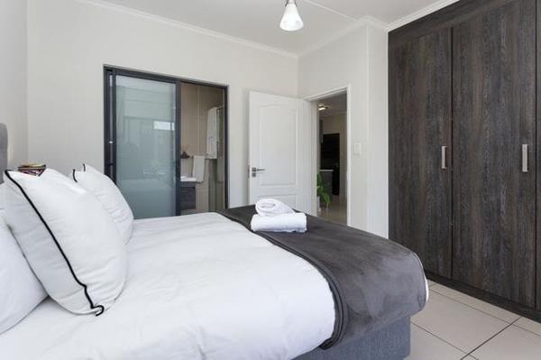 Upon entering, youre greeted by a beautifully tiled open-plan living area that extends seamlessly onto a private balcony, showcasing sweeping views of the Sandton skyline an ideal setting for entertaining or relaxing in style.