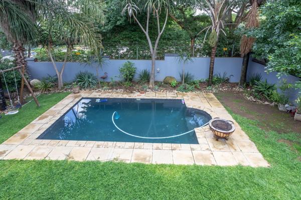 Sliding doors open out to the enormous enclosed patio overlooking a sparkling pool and lush garden.