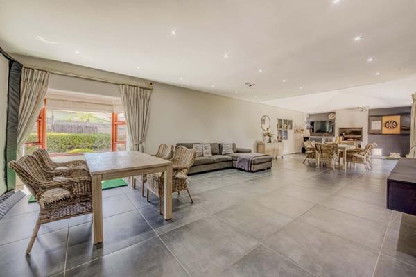 It really is something special, from the huge combined living room-dining room-entertainment room spilling out via stack doors to a fenced upper garden with a solar-heated swimming pool and a fire pit, overlooking the lower garden, to the beautiful gourmet kitchen and the modern bedroom wing. The house has been renovated recently and includes the conversion of closed rooms to wide open spaces and the addition of new floor tiles and lamination, ceilings, lights and fittings, as well as the installation of a solar geyser and 10 solar panels with a 5 kVA inverter.