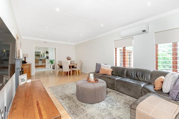 The bright hallway has a skylight, which sets the scene for this modern house. On its left is the squared-up kitchen fitted with many cupboards. On its right is the generous dining room-combined-lounge. The covered patio gives you another large room with its built-in pub and braai, and space for a lounge suite as well as an outdoor dining suite.