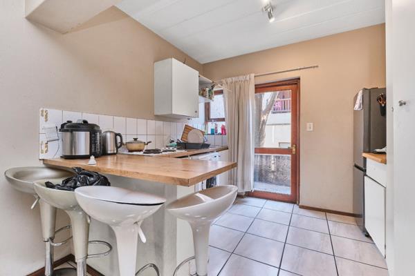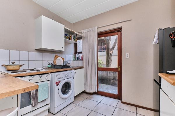 The home itself boasts a private, enclosed garden leading onto a covered patio, seamlessly connecting to the open-plan lounge and dining area. The kitchen is practical and well laid out, with space for one under-counter appliance, an electric stove, and a single fridge. A back door opens to an enclosed courtyard, ideal for hanging laundry.