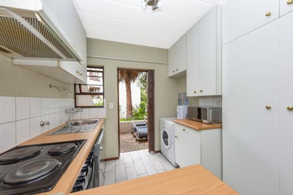 Offering 2 spacious bedrooms with built-in cupboards and 2 bathrooms. Main bathroom is en-suite with a bath and the 2nd bathroom has a shower. The open-plan kitchen is fitted with an abundance of crisp white cupboards and has space for a single door fridge and 1 appliance. The spacious living area opens onto the covered patio that overlooks the well-manicured open estate gardens. Natural grey tiling throughout the unit.