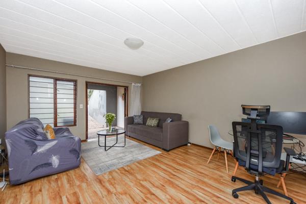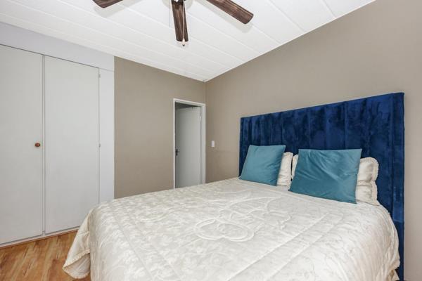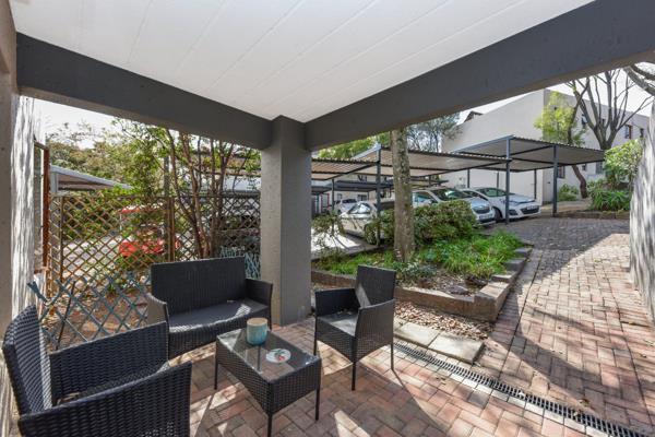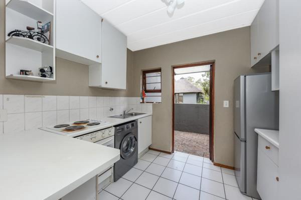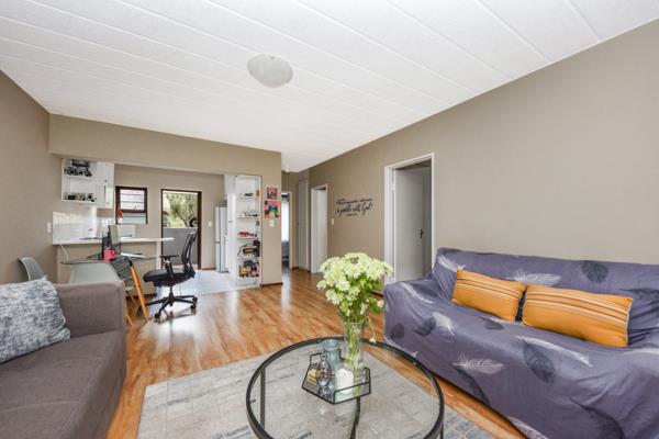 2 spacious bedrooms with built-in cupboards. The main bedroom has an en-suite bathroom with a bath. The second bathroom offers a shower. The living space is fitted with laminate flooring and opens onto the covered patio overlooking the semi-private garden. The open-plan kitchen features ample white cupboards, space for 1 appliance and a single door fridge. The kitchen opens onto a back patio with views of the estates established trees. 1 designated carport conveniently located right outside your doorstep for effortless access.