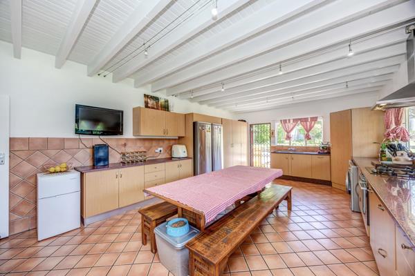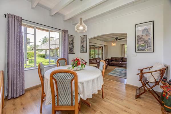 This beautifully maintained thatched home exudes charm and character, offering 4 spacious bedrooms, 2.5 bathrooms, and a separate one bedroom cottage set within a stunning, established garden. The ground floor features a large, well equipped kitchen, guest WC, dining room, and a spacious lounge complemented by a cozy TV room that opens onto a covered patio overlooking the sparkling pool. Adjacent to the pool is a pool room and a convenient pool WC with a shower.