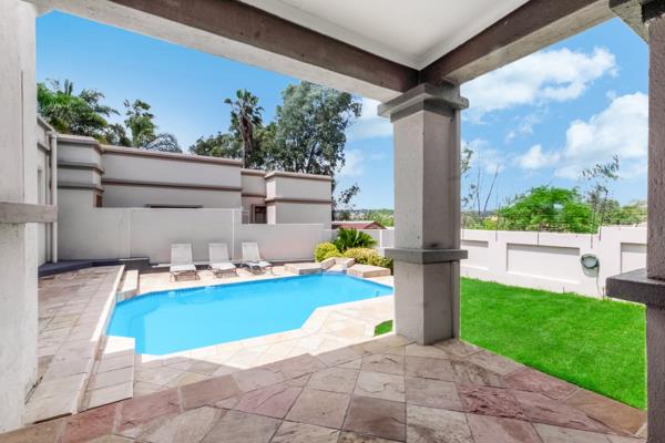 The right-hand wing offers Formal lounge with stackable on to Patio and 2 additional spacious rooms (18 sqm each) One could use as a 3rd bedroom with spacious office/ play room. Or you can open up a room onto the Pool Deck for additional entertainment. The garden offers a Pool with ample garden space. Double garages that have direct access into the courtyard / drying area and Kitchen Door. This side of the property is paved. Prepaid Electricity. The complex offers 24-hour security a green belt with gardens and play area. Please email me to view this property.
